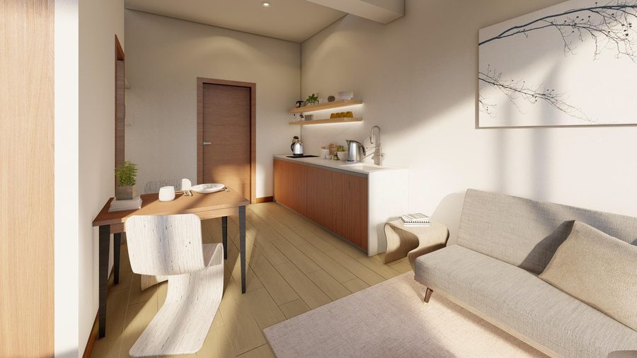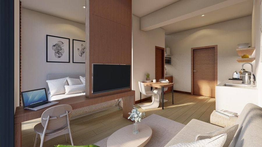 El diseño destaca por su fachada de ladrillo y detalles en pintura cementicia, mientras que los interiores cuentan con acabados de alta calidad, incluyendo pisos cerámicos imitación madera, ventanas de aluminio y puertas enchapadas de madera.