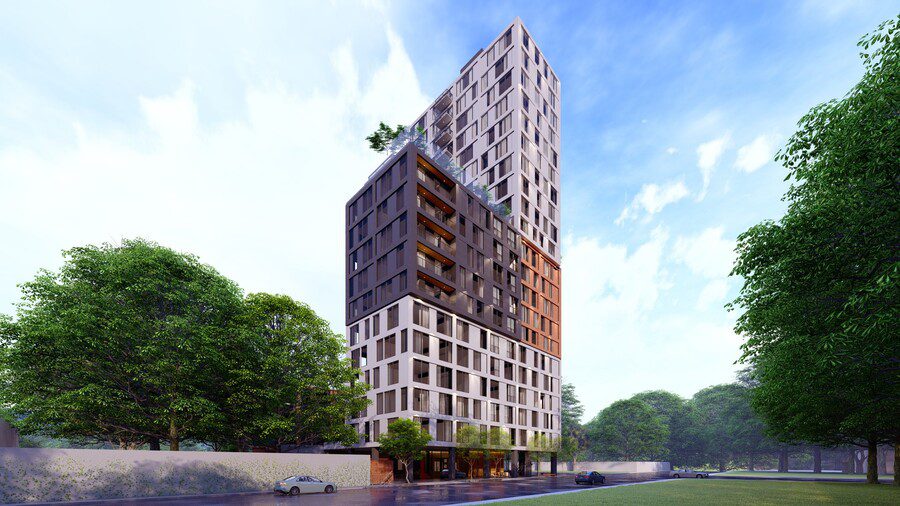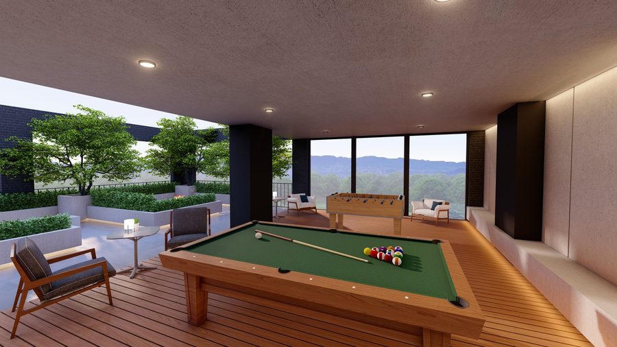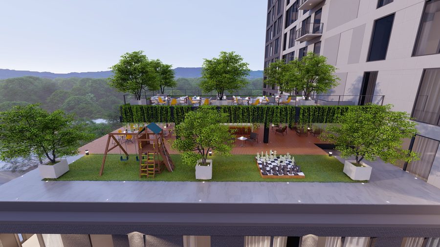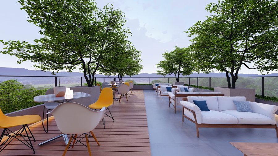 Ofrece unidades desde estudios de 21 m² hasta apartamentos de 3 habitaciones con área de servicio de hasta 174 m². Entre sus amenidades se incluyen gimnasio, coworking, lounge social, cafetería, solarium, sala de lectura, comercios y fire pits.