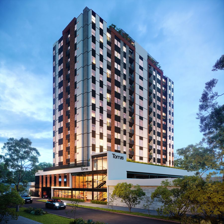 Torrus es un moderno desarrollo residencial, compuesto por una torre de 12 niveles que alberga apartamentos de 2 y 3 habitaciones. Cada unidad cuenta con parqueos individuales para vehículo y moto, y algunas ofrecen terraza privada.